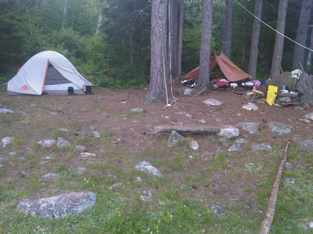 Checked out site and did my part by partially relocating and rebuilding the lower fire pit. Finally located the upper fire pit and campsite. Apparently 2 or 3 other tent pads have been covered by the large blow downs up there and the undergrowth – would need a bit of work with a swizzle stick, crossbow saw and maybe a chainsaw to hack out a tent pad or two in that area, as well as a bit more fire pit construction both upper and lower to turn this back into a 5-star. Unfortunately, one of last residents had tried to burn tin foil and drink mix wrappers in fire! Picked up what I could. Need to return at some point for camp maintenance and cleanup….and more fishing.